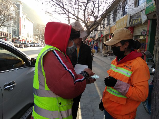 圖為管理人員為環(huán)衛(wèi)工人解答智能工牌使用方法